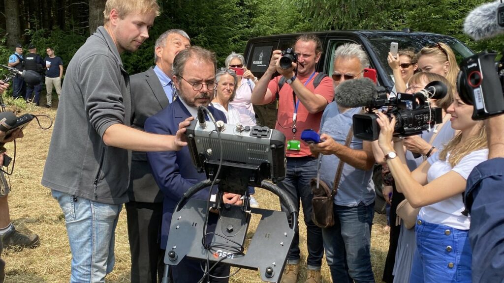Im zweiten Teil der Pressekonferenz – direkt im Suchgelände – zeigte Yannick Fahlenbock den Medienvertretern, wie die Georadargeräte funktionieren und präsentierte eine anschauliche Probegrabung. Den engagierten Auftakt zur Suche machte Präfekt Étienne Desplanques. Er fuhr selbst das dreirädrige Georadargerät über das Versuchsgelände. Das Georadar zeichnet Bodenanomalien bis in acht Meter Tiefe auf, die anzeigen, ob der Boden bewegt wurde, also ob dort bereits gegraben wurde.