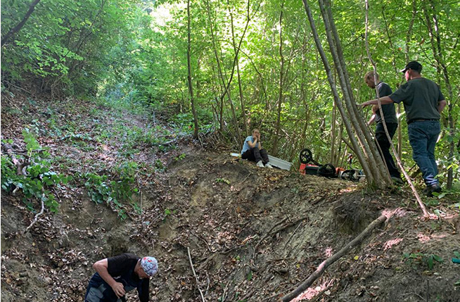 Craonne, den 27. August 2021. Der Volksbund und die französische Schwesterorganisation ONAC wollen eine weitere Sondierung am Winterbergtunnel in der französischen Picardie planen. Bei einer gemeinsamen Begehung mit Historikern und Spezialisten ließ sich dank Archiv-Recherchen und Auswertung von Geo-Daten erstmals der exakte Verlauf des Tunnels festlegen.